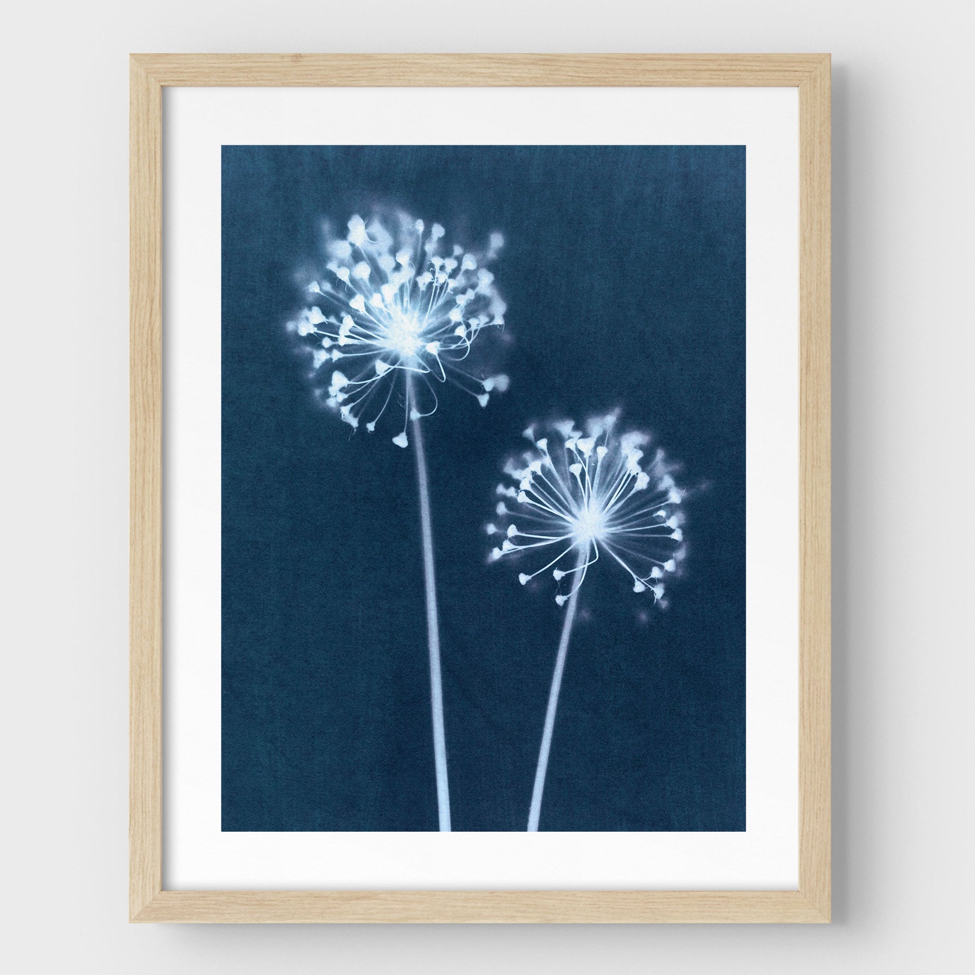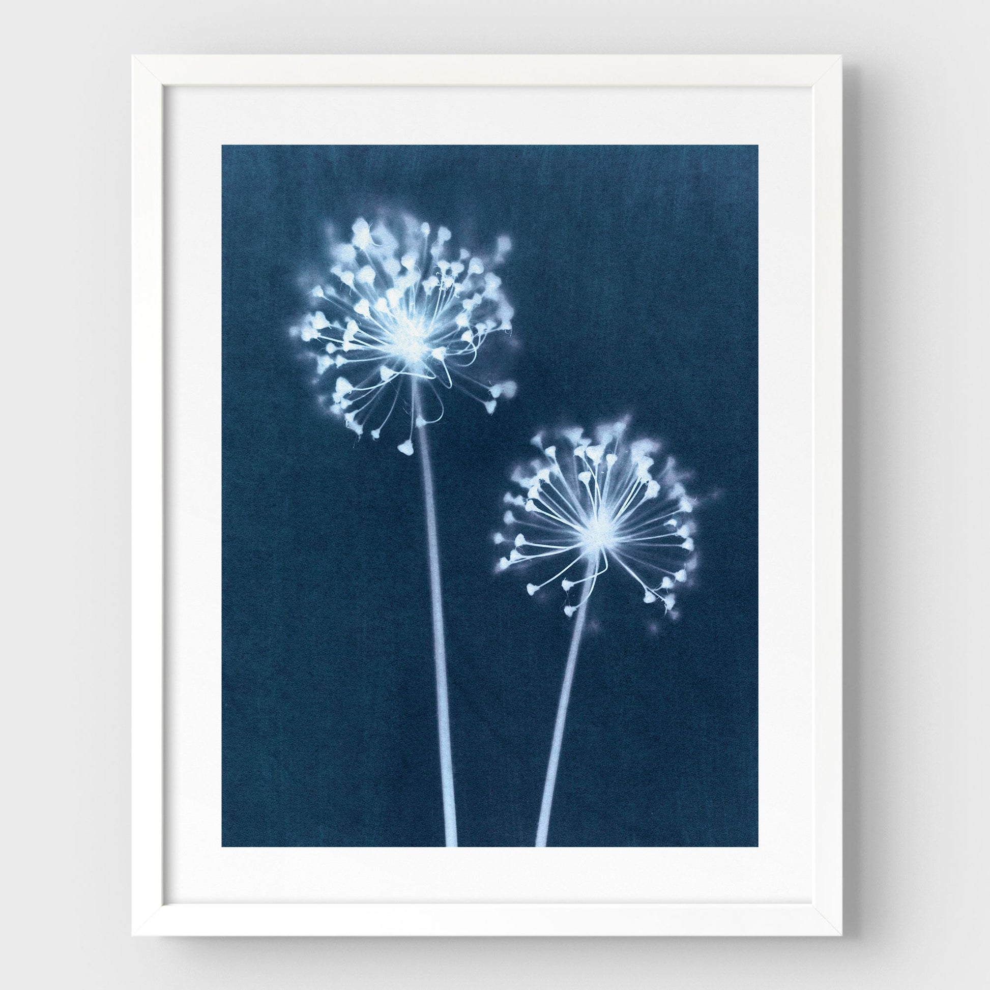 Expertly reproduced in a stunning cyanotype technique, this blue dandelion print brings a modern, nature-inspired touch to any space. Its rustic botanical design and bold navy/indigo color make it a perfect addition to boho or farmhouse décor while adding a touch of unique and elegant floral art.