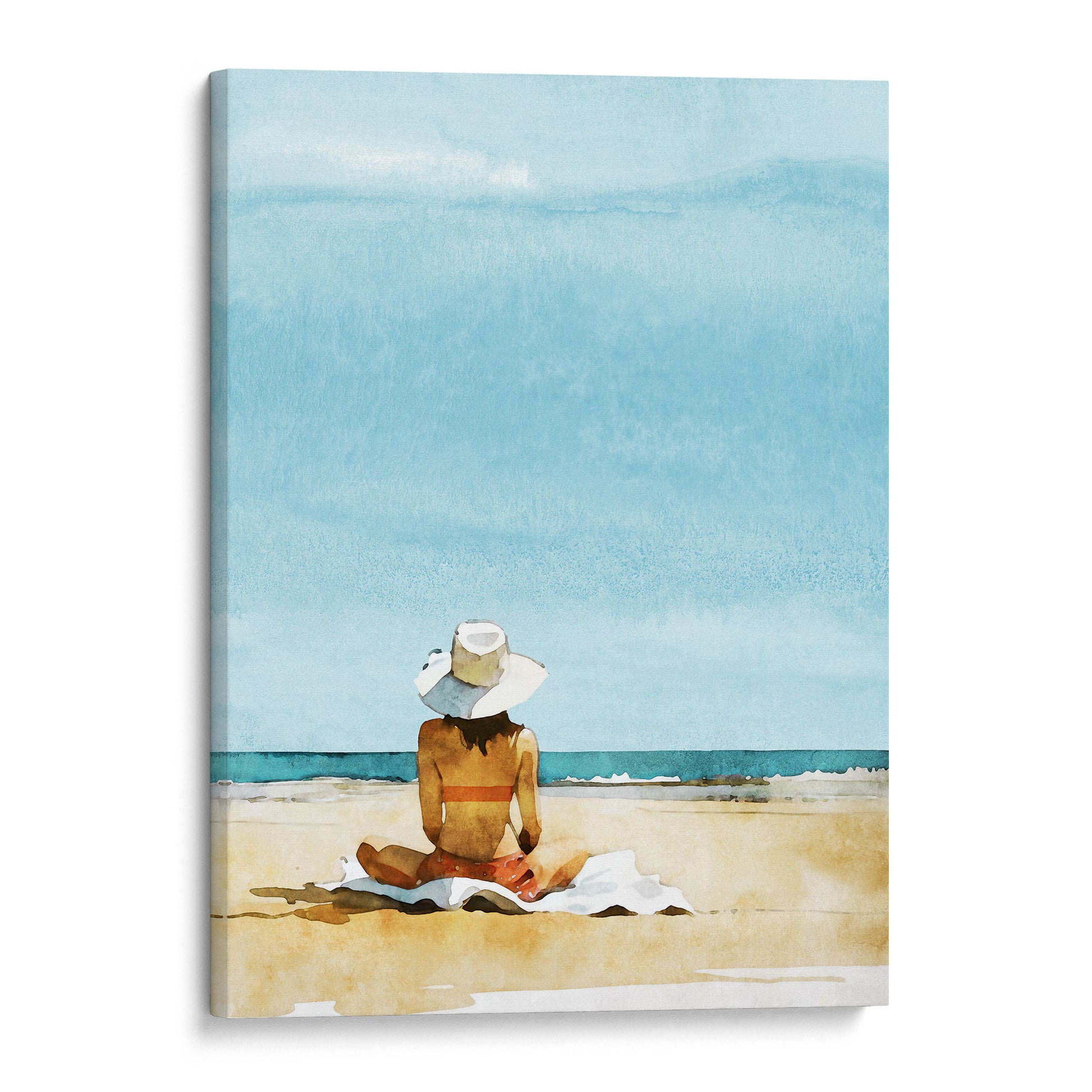 Add a touch of seaside serenity to your space with this watercolor print depicting a sun hat-wearing and swimsuit-clad woman lounging on a towel, taking in the endless blue sky and peaceful waves. Its simple yet serene layout and calming color scheme beautifully capture the essence of coastal life. A must-have for any living room, bedroom, or beachfront abode.